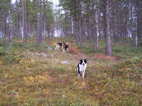 Vaknade tidigt, Edvin skulle till skolan och Lasse gick upp med honom. Jag låg kvar och piggnade till i lagom takt. Igår blev det en prommis i skogen, jag bestämde väg och självklart blev det ingen lätt liten skogspromenad. Här i väglöst land har vi ju inte speciellt många skogsstigar heller och de som finns är jag lite less på. Jag ledde alltså karavanen ut i skogen över berg och runt myrar, vid rökpausen gömde sig Lasse och Edvin så Grabbarna fick träna lite "sök". Det är ju nu inte så att man kan kalla det för riktigt sök eftersom jag inte ens lyfte rumpan från stenen när jag gav kommando :-) Swift tränade lite dirigering upp på en sten kanske 30-40 meter bort, bara lite skoj alltså.